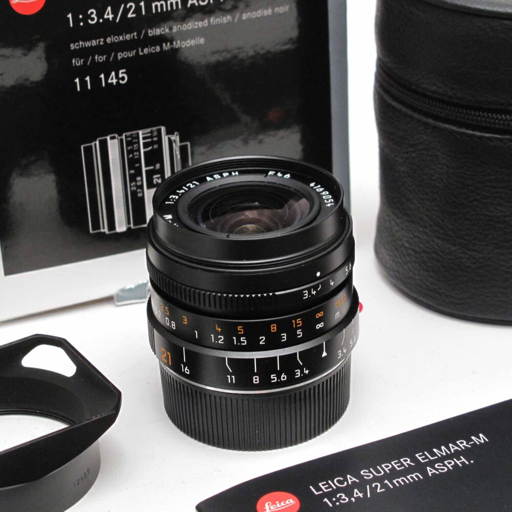 Leica 21mm f3.4 Super-Elmar-M ASPH., Peter Loy December 9, 2025 6-bit, 11145 + rear cap, 12465 hood, hood cap, case & box. Condition 3/D (minor dust). Near mint. c.2012