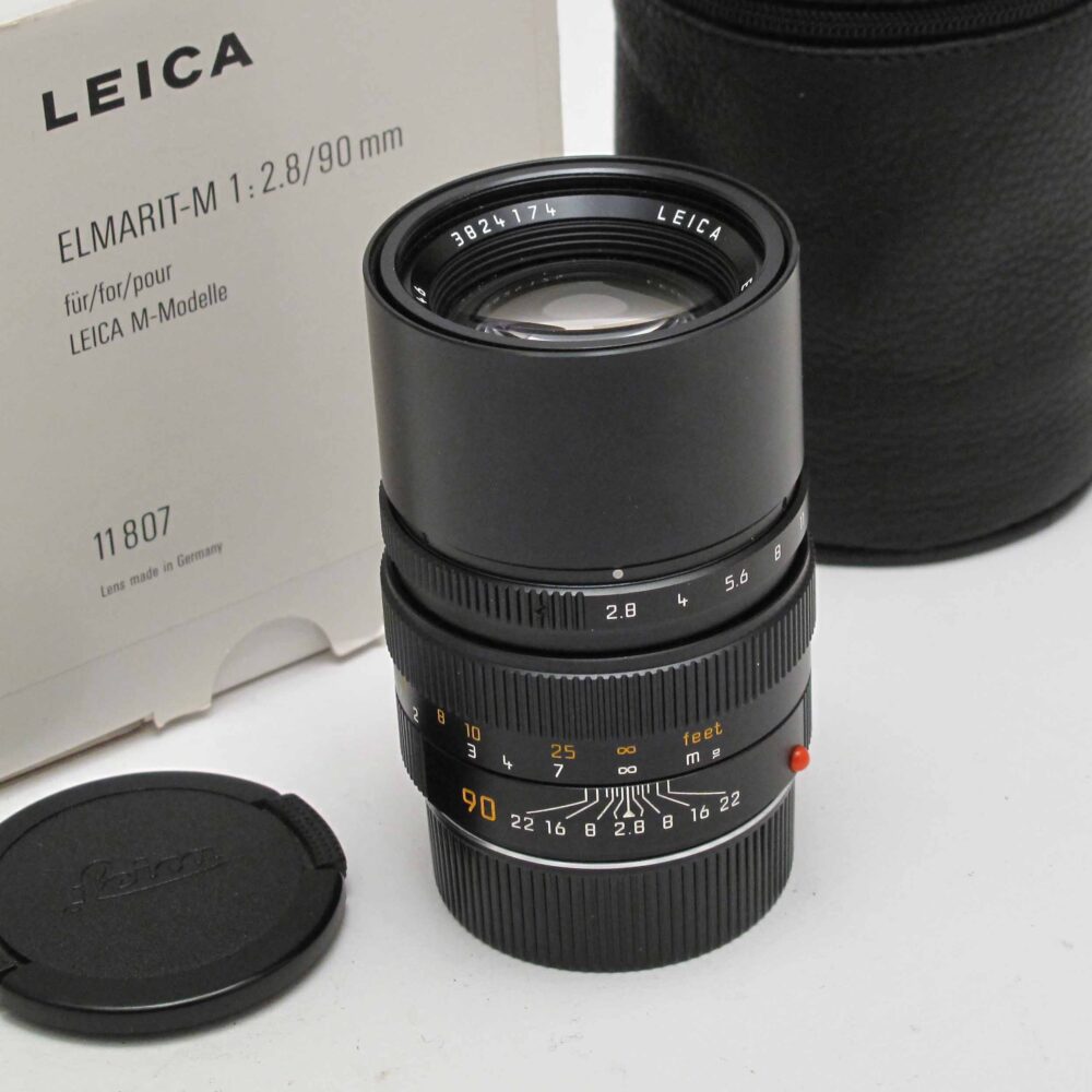 Leica 90mm f2.8 Elmarit-M, Peter Loy December 9, 2025 black, 11807 + caps, case & box. Condition 3/D (minor dust). Near mint. c.1998