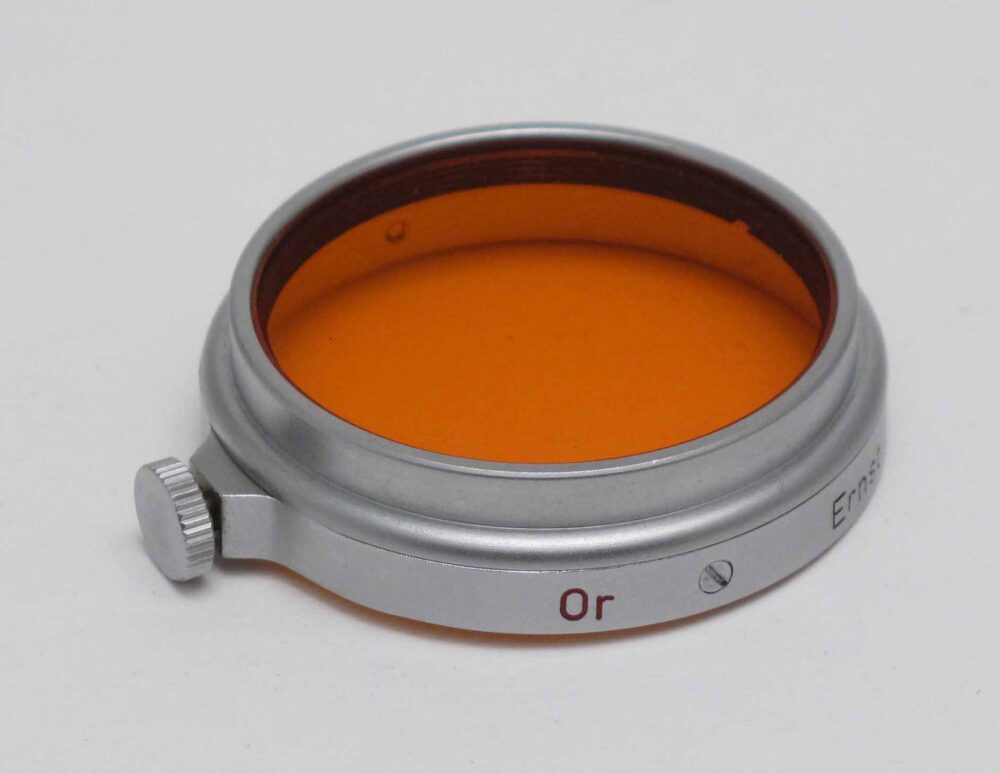 Leitz A36 orange filter, chrome. Peter Loy January 22, 2026 Condition 3/D. Near mint and hard to find with chrome mount