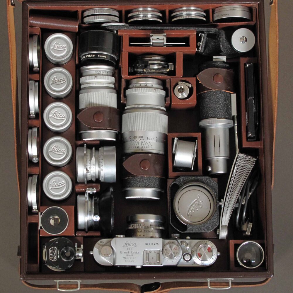 post-war (intro. 1955), 315x285x80mm, for screw mount camera + 6 lenses, finders, 5 cassettes, hoods, filters etc. With original Leitz card illustrating possible contents. Condition 4/D