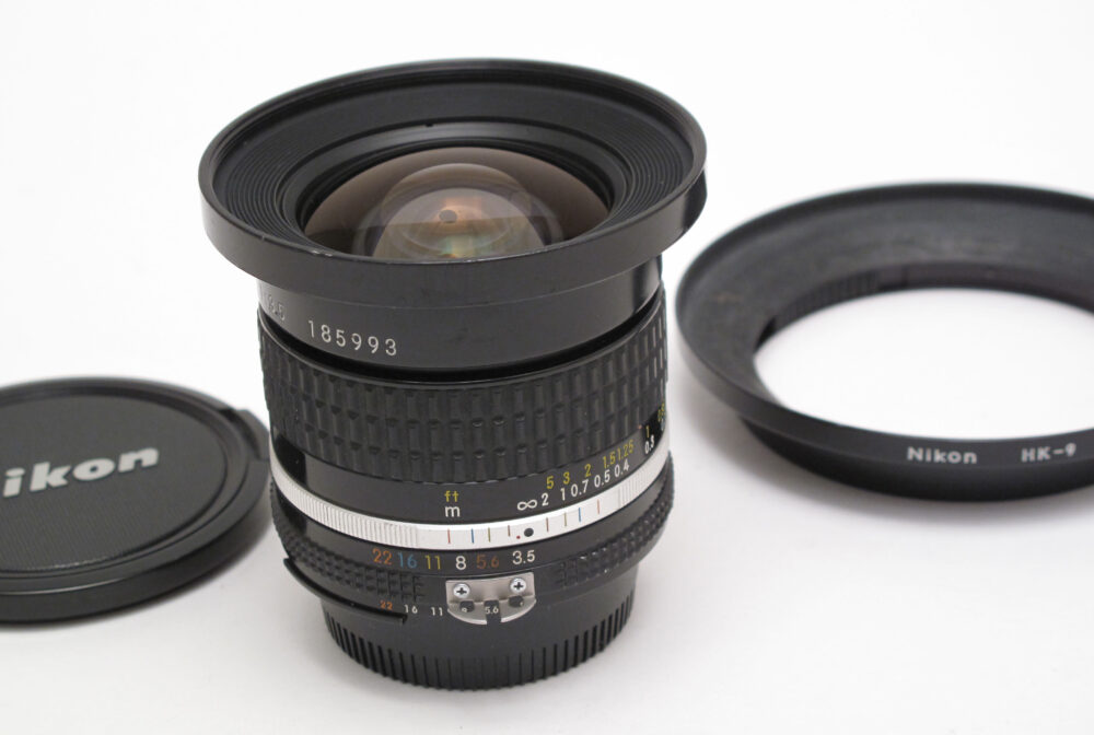 Nikkor 18mm f3.5 AIS Peter Loy December 22, 2025 + caps & HK-19 hood. Condition 4-5/D (minor dust), hood 5/D
