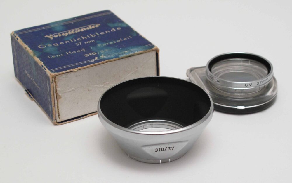 Voigtlander 310/37 lens hood Peter Loy November 7, 2025 for Bessa II etc. + worn box + 317/37 UV filter. Condition 3-4/D