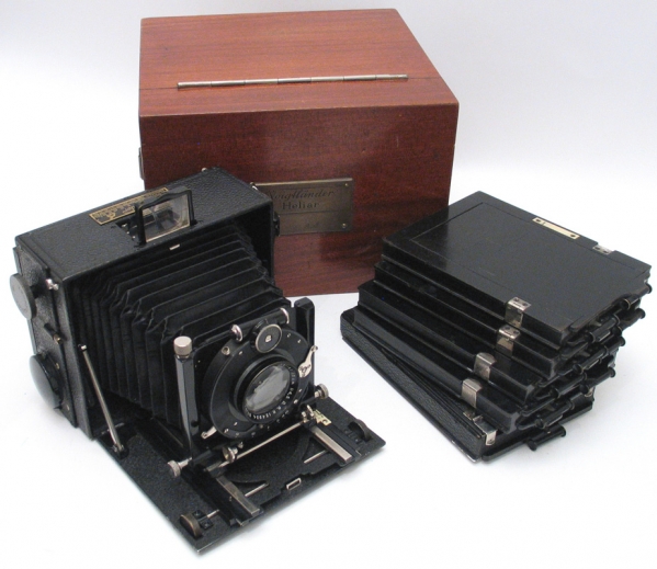 3rd version, 15cm f4.5 Heliar, Compound + 5 plate holders, film pack adapter, yellow filter & wooden case with metal plaque with ‘Voigtlander Heliar’ engraving. This is the very rare 3rd version of the Heliar camera and is the only one we have seen. This actual camera is comprehensively described and pictured in ‘Voigtlander Matters’ Number 22 (Autumn 1999/2000)